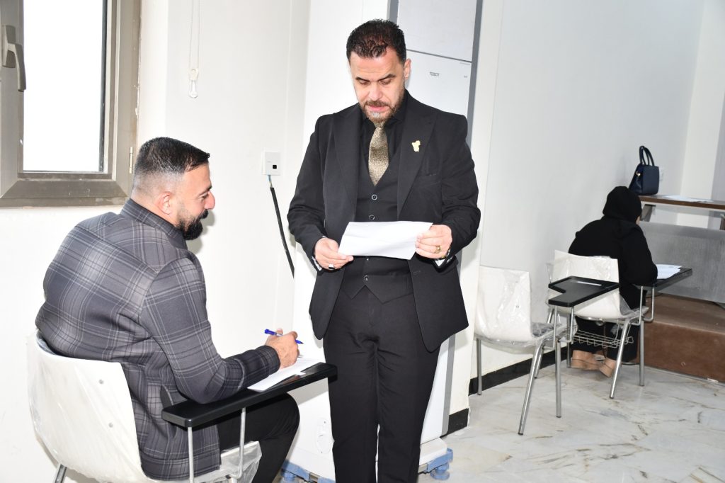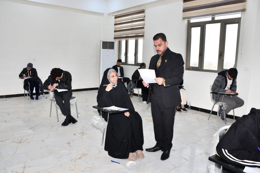 كتب/ إعلام الكلية:تفقد السيد عميد كلية التربية للعلوم الإنسانية بجامعة ديالى الأستاذ الدكتور لؤي صيهود التميمي اليوم الأحد الموافق ٢١ كانون الأول ٢٠٢٥م، سير الامتحانات النهائية لطلبة الدراسات العليا (الماجستير والدكتوراه) للفصل الدراسي الأول، في الأقسام العلمية الخمسة: قسم اللغة العربية، وقسم اللغة الإنكليزية، وقسم التاريخ، وقسم الجغرافية، وقسم العلوم التربوية والنفسية.واطلع السيد العميد خلال جولته التفقدية على آلية تنظيم الامتحانات ومستوى الالتزام بالتعليمات والضوابط الوزارية، مؤكّدًا أهمية توفير الأجواء المناسبة التي تضمن أداء الطلبة لامتحاناتهم بكل شفافية وعدالة، بما يعكس حرص الكلية على جودة العملية التعليمية والرصانة العلمية.كما أشاد السيد العميد بجهود اللجان الامتحانية والكادر التدريسي والإداري في إنجاح الامتحانات، مشددًا على الاستمرار في تذليل المعوقات وتقديم الدعم اللازم للطلبة.ويأتي هذا التفقد في إطار سعي الكلية إلى تعزيز جودة التعليم العالي وتحقيق هدف التنمية المستدامة الرابع (التعليم الجيد)، من خلال ضمان بيئة تعليمية آمنة ومنظمة تسهم في إعداد كوادر علمية مؤهلة لخدمة المجتمع.