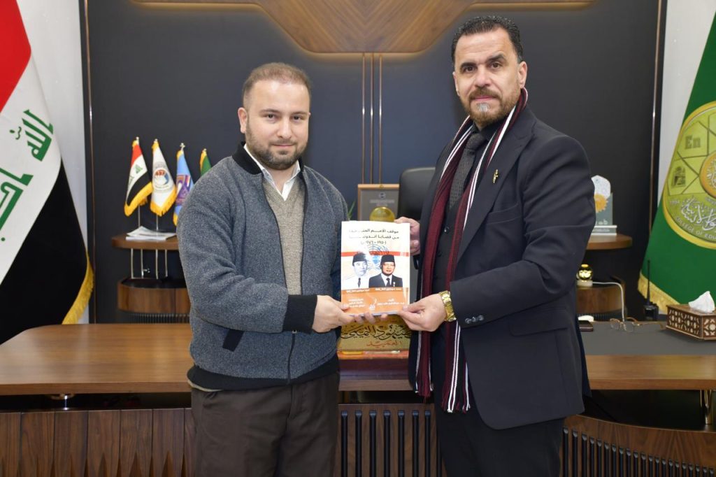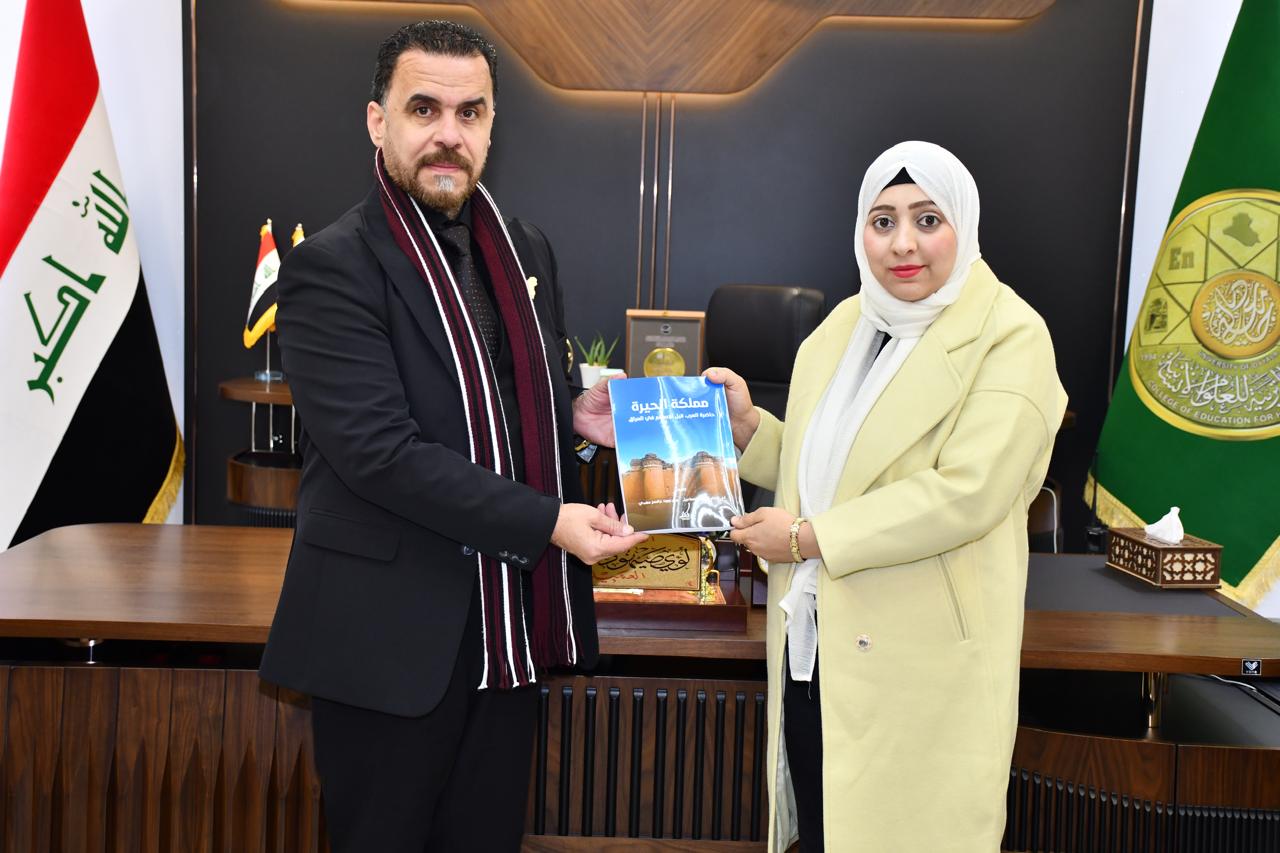 كتب/ إعلام الكلية:أهدى التدريسيان من قسم التاريخ في كلية التربية للعلوم الإنسانية بجامعة ديالى، المدرس الدكتور عبد الحكيم طلب جعفر والمدرس المساعد ورود جاسم مهدي، السيد عميد الكلية الأستاذ الدكتور لؤي صيهود التميمي مؤلفيهما العلميين، تثمينًا للدعم المتواصل الذي توليه عمادة الكلية للحركة العلمية والبحثية.وجاء المؤلف الأول بعنوان «موقف الأمم المتحدة من قضايا إندونيسيا» للمدرس الدكتورعبد الحكيم طلب جعفر، متناولًا بالدراسة والتحليل دور المنظمة الدولية في القضايا الإندونيسية المختلفة، فيما حمل المؤلف الثاني عنوان «مملكة الحيرة حاضرة العرب قبل الإسلام في العراق» للمدرس المساعد ورود جاسم مهدي، مسلطًا الضوء على الأهمية التاريخية والحضارية لمملكة الحيرة في تاريخ العرب قبل الإسلام.وأشاد السيد عميد الكلية بهذه الجهود العلمية الرصينة، مؤكدًا حرص عمادة الكلية على دعم النتاجات الأكاديمية التي تسهم في تعزيز البحث العلمي وخدمة المعرفة التاريخية، بما ينسجم مع أهداف التنمية المستدامة ولا سيما الهدف الرابع (التعليم الجيد)، من خلال دعم البحث العلمي وإنتاج المعرفة الرصينة في المؤسسات الأكاديمية.