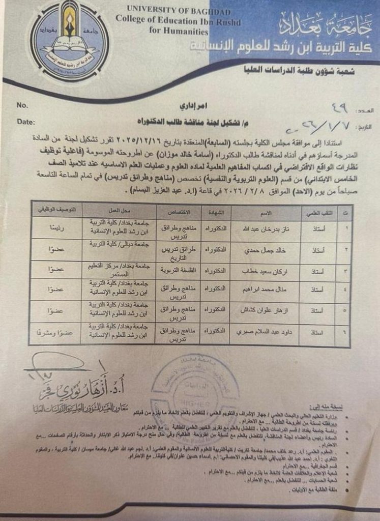رئيس قسم العلوم التربية والنفسية يشارك في عضوية لجنة مناقشة اطروحة دكتوراه في جامعة بغداد