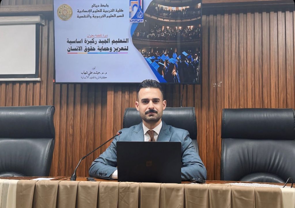 كتب/ إعلام الكلية:عقدت وحدة حقوق الإنسان بالتعاون مع قسم العلوم التربوية والنفسية، في كلية التربية للعلوم الإنسانية بجامعة ديالى، ندوة علمية بعنوان “التعليم الجيد ركيزة أساسية لتعزيز وحماية حقوق الإنسان” . سعت الندوة التي ناقش محاورها المدرس المساعد هيثم علي شهاب، إلى تعريف الطلبة بأهمية التعليم الجيد في بناء الفرد والمجتمع، ودوره في ترسيخ قيم المساواة والعدالة وتعزيز الوعي بحقوق الإنسان.وتطرقت الندوة إلى أن التعليم الجيد لا يقتصر على نقل المعرفة، بل يُعدّ أداة مهمّة لتمكين الفرد وتعزيز كرامته، من خلال تنمية قدرته على فهم حقوقه وواجباته والمشاركة الإيجابية في المجتمع. وأوضحت أن ارتفاع مستوى التعليم يسهم في بناء مجتمع واعٍ يحترم الحقوق، ويحدّ من مظاهر العنف والتمييز، مما يجعله أساسًا لحماية حقوق الإنسان ودعم التنمية الشاملة.كما أكدت الندوة أن التعليم الجيد يُعدّ عنصرًا مهمًا في تعزيز السلم المجتمعي، من خلال نشر قيم التسامح واحترام التنوع الثقافي والاجتماعي، وتشجيع الطلبة على التعامل الإيجابي مع الاختلافات. وشددت على ضرورة تعزيز الوعي بحقوق الفئات المختلفة في المجتمع، ولا سيما الطلبة من ذوي الاحتياجات الخاصة لضمان تحقيق مبدأ تكافؤ الفرص.وخرجت الندوة توصيات بعدة أبرزها: إقامة الندوات التي تنمّي القيم التربوية والأخلاقية واحترام حقوق الإنسان، وتنظيم الورش التوعوية حول أهمية التنوع الثقافي والاجتماعي، إضافة إلى تنفيذ برامج تثقيفية لدعم حقوق الطلبة من ذوي الاحتياجات الخاصة. ويأتي هذا النشاط في إطار دعم الهدف الرابع من أهداف التنمية المستدامة (التعليم الجيد)، الذي يؤكد أهمية توفير تعليم عالي الجودة يسهم في بناء مجتمع عادل ومتسامح.