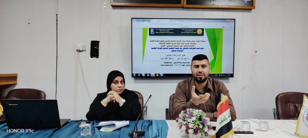 كتب/ إعلام الكلية: عقد قسم الجغرافية في كلية التربية للعلوم الإنسانية بجامعة ديالى ندوة علمية بعنوان “حقوق الإنسان بين الفرد والمجتمع”، قدّمها كلٌّ من المدرس سهى سالم، والمدرس المساعد جهاد كاظم عباس، وبحضور عدد من التدريسيين والطلبة.تناولت الندوة مفهوم حقوق الإنسان بوصفها مبادئ أخلاقية ومعايير قانونية عالمية تكفل كرامة الإنسان وحريته دون تمييز، مشيرةً إلى أبرز هذه الحقوق مثل الحق في الحياة، والحرية، والأمان، والتعليم، والعمل. كما سلّطت الضوء على تصنيف حقوق الإنسان إلى حقوق فردية تشمل حرية التعبير والخصوصية والحق في التعليم والصحة، وحقوق مجتمعية تتعلق بالعدالة، والبيئة الآمنة، والمشاركة في صنع القرار، والحفاظ على الهوية الثقافية.وبيّنت الندوة طبيعة العلاقة التكاملية بين حقوق الفرد وحقوق المجتمع، مؤكدةً أن تحقيق التوازن بينهما يُعدّ أساسًا لبناء مجتمع مستقر، حيث تنتهي حرية الفرد عندما تبدأ حرية الآخرين. كما ناقشت الجهات المسؤولة عن حماية هذه الحقوق، بدءًا من الدولة والقانون، مرورًا بالمؤسسات التربوية والصحية، وصولًا إلى دور الأفراد في ترسيخ ثقافة احترام الحقوق داخل المجتمع.وتطرقت الندوة إلى آليات تعزيز ثقافة حقوق الإنسان، من خلال التربية السليمة، وربط الحقوق بالواجبات، وتحويل هذه المبادئ إلى سلوك يومي يعكس وعي الأفراد ومسؤوليتهم تجاه الآخرين.واختُتمت الندوة بعدد من التوصيات، أبرزها أن بناء مجتمع قوي يبدأ من شعور الفرد بالأمان والاحترام، وأن حقوق الإنسان ليست ترفًا بل ضرورة أساسية لاستقرار المجتمعات وتقدمها.ويأتي هذا النشاط في إطار تحقيق الهدف السادس عشر من أهداف التنمية المستدامة (السلام والعدل والمؤسسات القوية)، من خلال نشر الوعي بثقافة حقوق الإنسان وتعزيز مبادئ العدالة والمساواة داخل المجتمع.