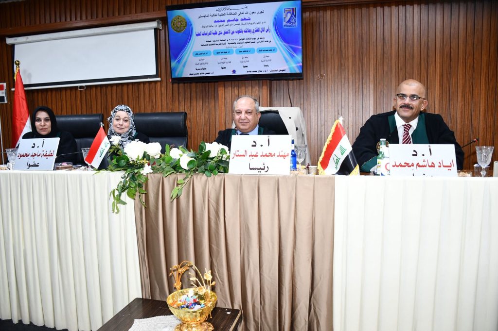 ناقشت كلية التربية للعلوم الإنسانية بجامعة ديالى رسالة الماجستير الموسومة بـ ( رأس المال الفكري وعلاقته بالخوف من الاخفاق لدى طلبة الدراسات العليا ).