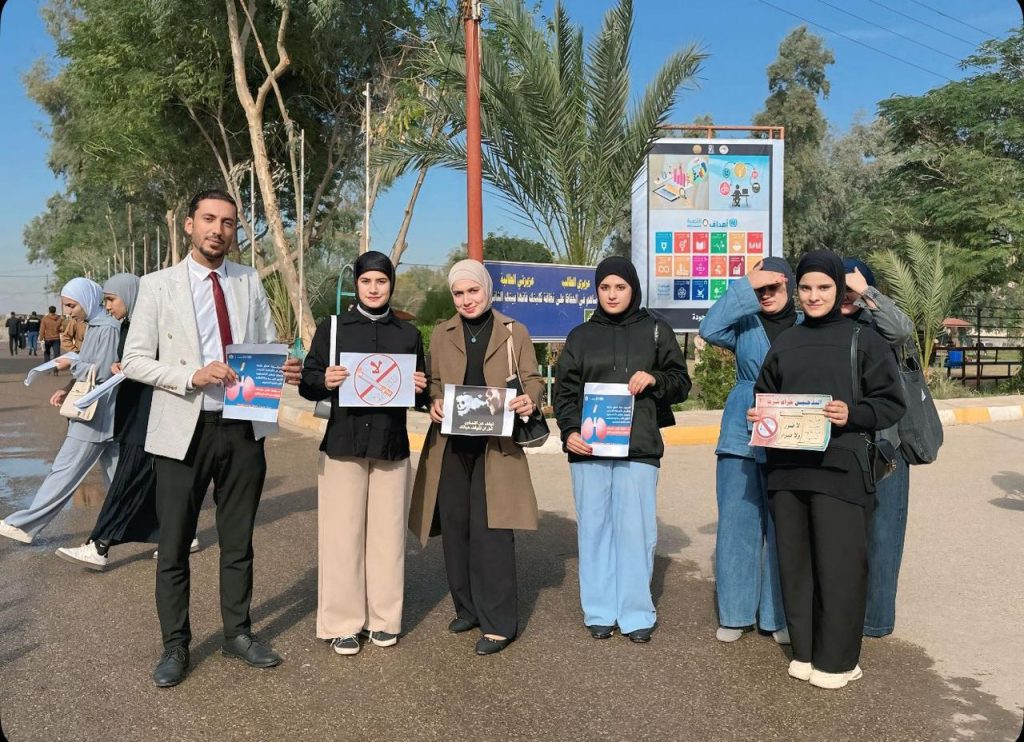 كتب/ إعلام الكلية:نظّم قسم الجغرافية في كلية التربية للعلوم الإنسانية بجامعة ديالى حملة توعوية بعنوان “مضار التدخين على صحة الإنسان”، بإشراف المدرس الدكتور مروان عبد إبراهيم محمد، وذلك ضمن الأنشطة الهادفة إلى تعزيز الوعي الصحي لدى الطلبة وتوجيههم نحو سلوكيات تسهم في حماية صحتهم وسلامتهم.وهدفت الحملة إلى إبراز الأضرار الصحية الخطيرة الناتجة عن التدخين المباشر وغير المباشر، وما يسببه من أمراض للجهاز التنفسي والقلب والسرطانات، فضلًا عن تأثيراته البيئية والاجتماعية. كما تضمنت الحملة توزيع ملصقات إرشادية وتقديم شرح توعوي حول ضرورة الحد من هذه الظاهرة وتعزيز ثقافة الحياة الصحية داخل الوسط الجامعي.وخلصت الحملة إلى جملة من التوصيات شملت ضرورة تكثيف البرامج التوعوية داخل الكلية، وتنظيم ورش تثقيفية دورية حول مخاطر التدخين، فضلاً عن توفير برامج مساندة للطلبة الراغبين بالإقلاع عنه، إلى جانب نشر بوسترات صحية في أروقة الكلية بشكل مستمر لتعزيز الوعي والسلوك الصحي.جاءت الحملة منسجمة مع الهدف الثالث: الصحة الجيدة والرفاه، من خلال نشر الوعي الصحي والحد من السلوكيات الضارة التي تهدد صحة الإنسان وتسهم في زيادة نسب الأمراض المزمنة.