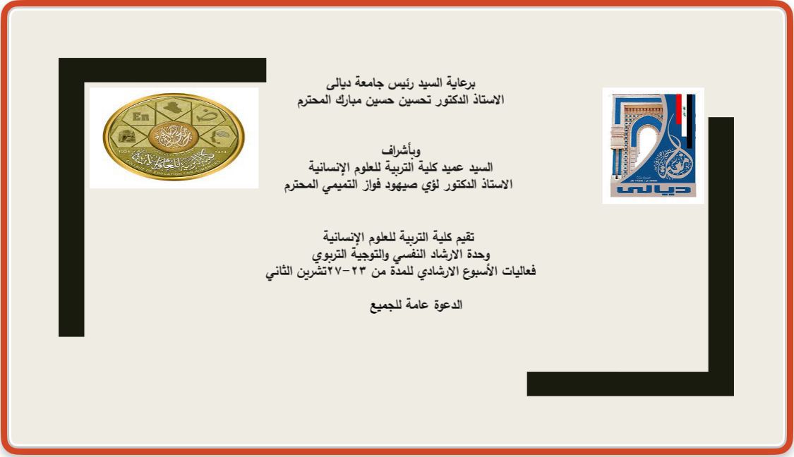 إعــلان الأسبوع الإرشادي تدعو وحدة الإرشاد النفسي والتوجيه التربوي في كلية التربية للعلوم الإنسانية أبناءها الطلبة للمشاركة في فعاليات الأسبوع الإرشادي، والذي ستستمر أنشطته لمدة أربعة أيام، بهدف تعزيز الوعي النفسي وتنمية المهارات الشخصية، وبما يسهم في إيجاد بيئة جامعية …
