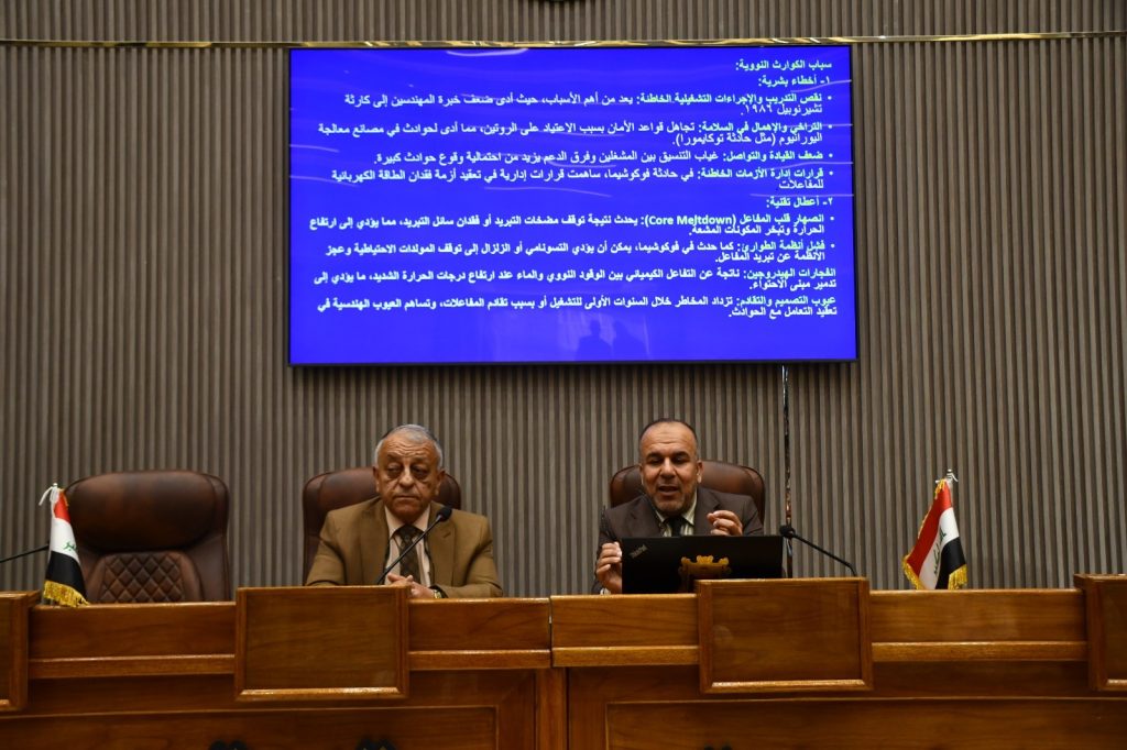The Continuing Education Division at the College of Education for Humanities, in cooperation with the Continuing Education Center at Diyala University, held a scientific seminar on nuclear disasters, their types, causes, and prevention mechanisms. The seminar, attended by faculty members and students, aimed to raise scientific awareness of the environmental and health risks associated with nuclear energy.The seminar, presented by Dr. Firas Abdul Ahmed and Professor Dr. Firas Mahmoud Hadi, explained that nuclear disasters are accidents that lead to the leakage of radioactive materials, posing a significant threat to humans and the environment. They are divided into main types, including nuclear reactor accidents, nuclear explosions, and leaks of radioactive materials during transport or storage. Prominent historical examples include the Chernobyl disaster in Ukraine and the Fukushima Daiichi accident in Japan, both of which have had long-lasting environmental and health consequences. The symposium addressed the consequences of such disasters, including widespread radioactive contamination of soil, water, and air, and the potential for serious illnesses such as cancer and genetic mutations, as well as economic and social losses. It also explained that the most prominent causes of nuclear disasters are human error, mismanagement, inadequate training, technical malfunctions, or failures in cooling and safety systems, in addition to the impact of natural disasters such as earthquakes and tsunamis, or wars and acts of sabotage.The symposium emphasized that preventing nuclear disasters depends on implementing strict safety systems, continuous monitoring, and developing effective emergency plans to mitigate risks, in line with the Sustainable Development Goals, particularly Goal 3 (Good Health and Well-being) and Goal 13 (Climate Action), by promoting a culture of safety and protecting people and the environment from radiological hazards.