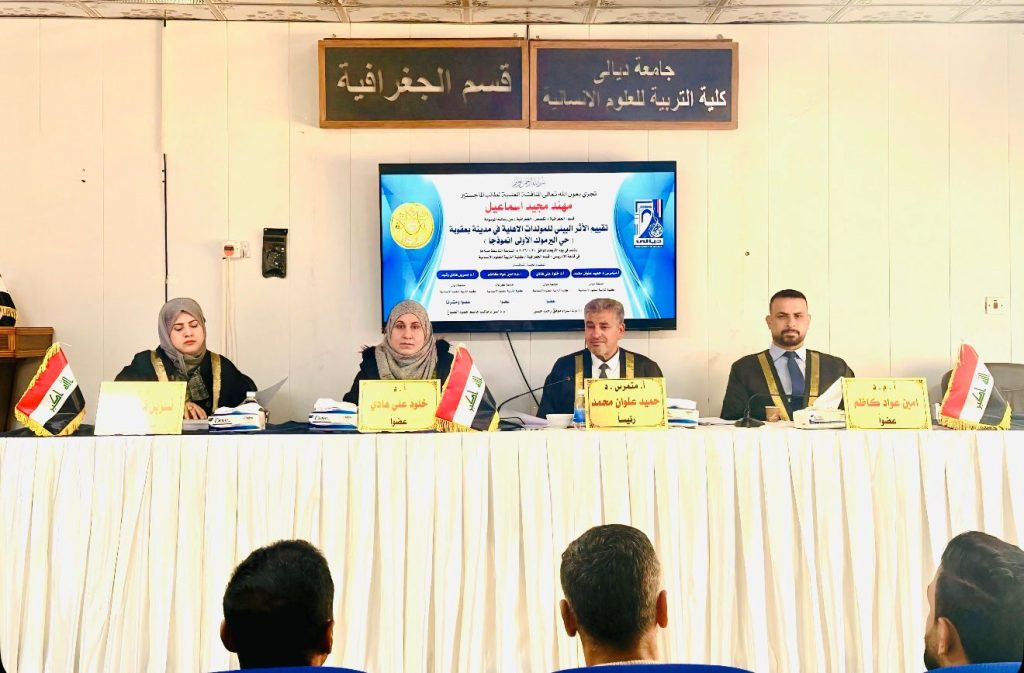 The College of Education for Humanities Discusses the Environmental Impact Assessment of Private Generators in Baqubah City: Al-Yarmouk First Neighborhood as a Case StudyCollege Media OfficeThe College of Education for Humanities at the University of Diyala discussed a master’s thesis in Geography entitled “Environmental Impact Assessment of Private Generators in Baqubah City: Al-Yarmouk First Neighborhood as a Case Study.”The study was presented by the student Muhannad Majid Ismail and supervised by Prof. Dr. Nasreen Hadi Rasheed. It aimed to assess the environmental impact of private electricity generators in Baqubah City, taking the Al-Yarmouk First neighborhood as a representative model. The study focused on identifying the main environmental problems resulting from these generators by measuring exhaust gases as a source of air pollution and assessing noise levels at generator sites during the summer and winter seasons. The recorded noise levels exceeded the international standard set by the World Health Organization (WHO), which is 80 dB.The findings revealed spatial variation from one location to another and temporal variation across seasons during field monitoring of pollutants emitted by private generators in the study area. Temperature was identified as a key climatic factor influencing the increase in pollutants, particularly during the summer season. The study also found a direct relationship between population size and the number of private generators, as population growth leads to higher energy demand, an increase in generator numbers, and greater pollutant emissions. In addition, carbon dioxide (CO₂) recorded its highest concentration in the air during the summer season at several monitoring sites.The study recommended improving generator performance by adopting modern, high-efficiency generators to reduce fuel consumption and harmful emissions. It also emphasized increasing regular maintenance to ensure operational efficiency, equipping generators with effective filters to purify exhaust gases, and improving fuel management strategies through governmental or community support for generator owners. Further recommendations included strengthening regulatory oversight to ensure compliance with environmental and public health standards, raising community awareness through campaigns that promote reducing reliance on conventional generators and supporting clean energy alternatives, and preventing improper disposal of used oils that cause serious soil damage and visual pollution.This study aligns with the Sustainable Development Goals, particularly Goal 7: Affordable and Clean Energy and Goal 11: Sustainable Cities and Communities.